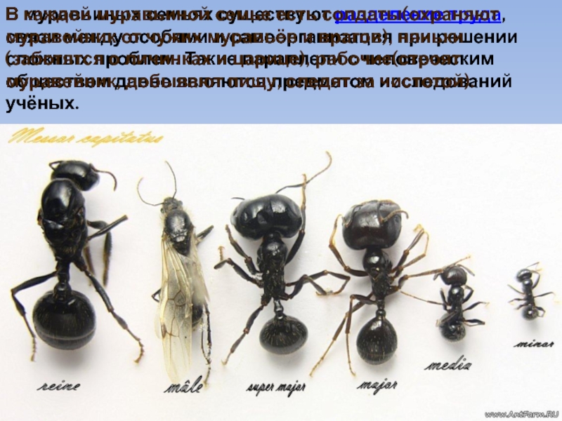 Слайд 17В муравьиных семьях существуют разделение труда, связи между особями и самоорганизация