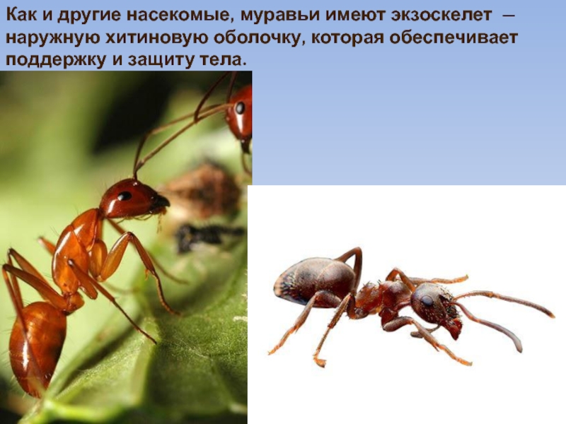 Слайд 13Как и другие насекомые, муравьи имеют экзоскелет — наружную хитиновую оболочку,