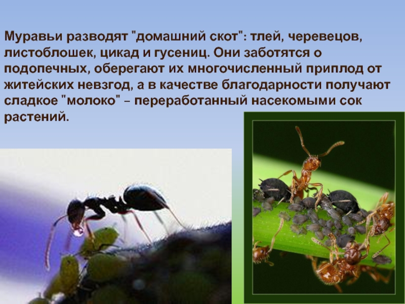 Слайд 29Муравьи разводят "домашний скот": тлей, черевецов, листоблошек, цикад и гусениц. Они