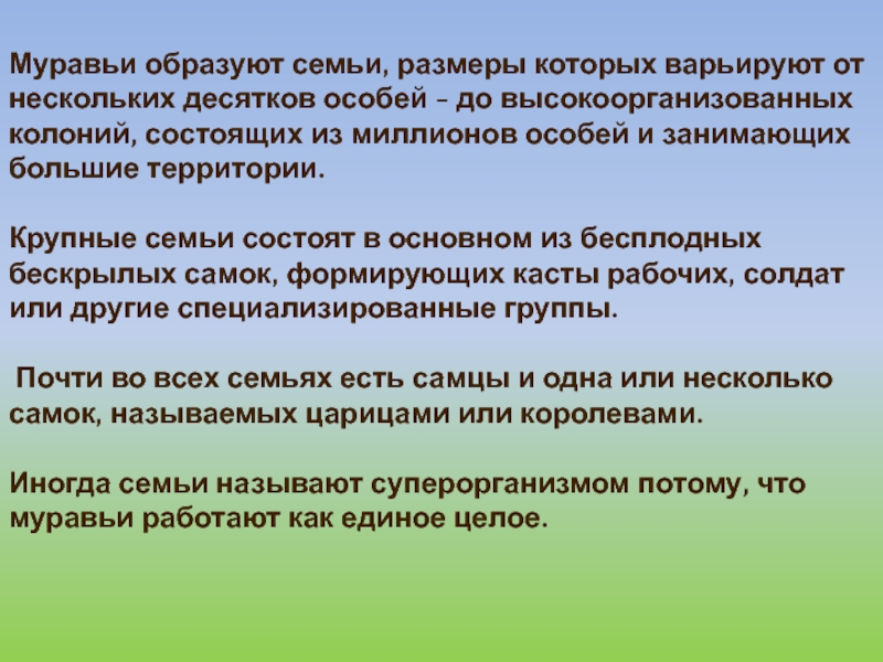 Слайд 16Муравьи образуют семьи, размеры которых варьируют от нескольких десятков особей -