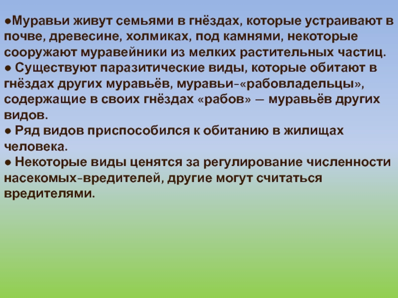 ● Существуют паразитические виды, которые обитают в гнёздах других муравьёв, муравьи-«рабовладельцы», содержащие в своих гнёздах «рабов» — муравьёв других видов.