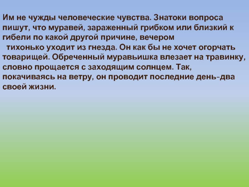 Слайд 28Им не чужды человеческие чувства. Знатоки вопроса пишут, что муравей, зараженный