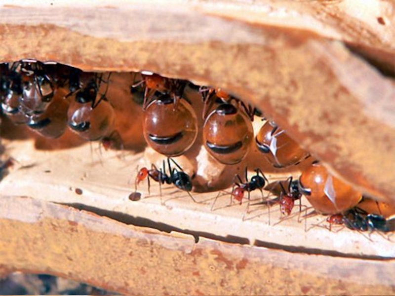 сок сахарного дуба, съедают его, сколько могут, а дома изо рта в рот передают своим собратьям - живым сосудам. Желудок и брюшко этих чудесных муравьев могут растягиваться, точно резиновые. Они достигают размеров виноградины, прицепляются лапками к потолку муравьиного "продуктового склада" и хранят запасенный мед для личинок.