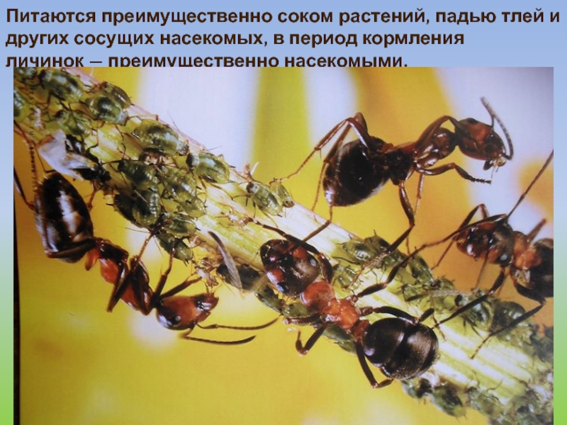 Слайд 5Питаются преимущественно соком растений, падью тлей и других сосущих насекомых, в