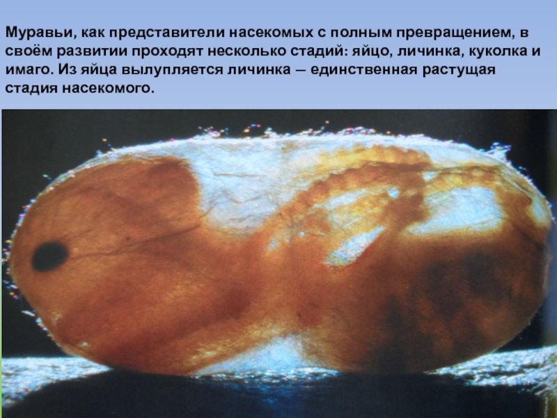Слайд 19Муравьи, как представители насекомых с полным превращением, в своём развитии проходят