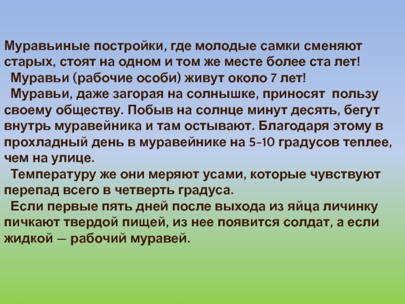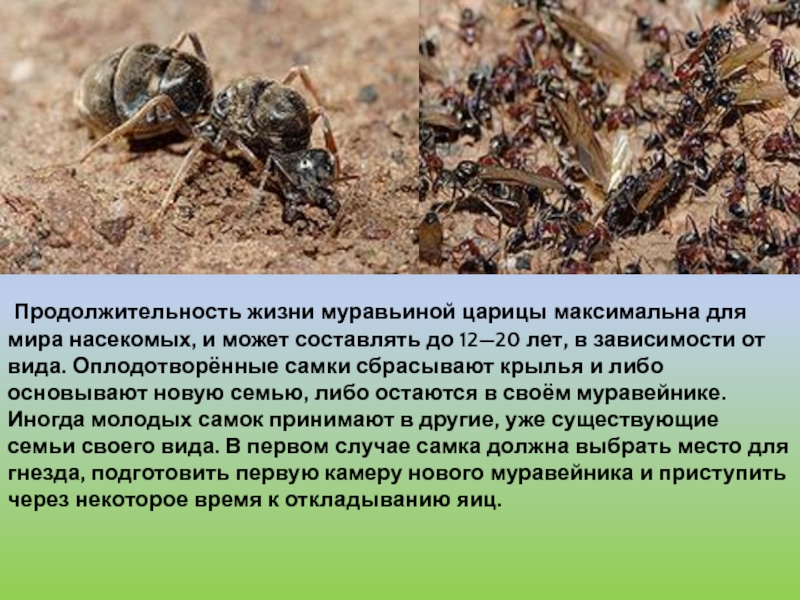 Слайд 18 Продолжительность жизни муравьиной царицы максимальна для мира насекомых, и может