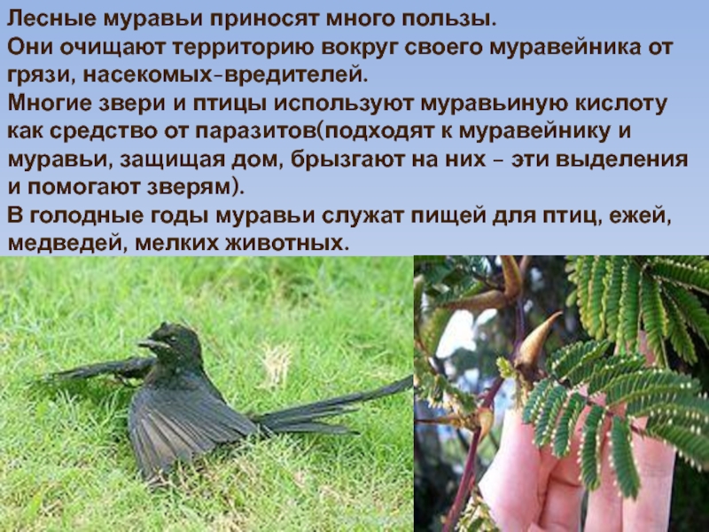 Многие звери и птицы используют муравьиную кислоту как средство от паразитов(подходят к муравейнику и муравьи, защищая дом, брызгают на них – эти выделения и помогают зверям).