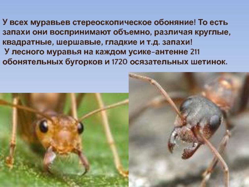 Слайд 30У всех муравьев стереоскопическое обоняние! То есть запахи они воспринимают объемно,