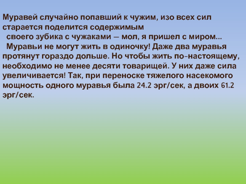 Слайд 26Муравей случайно попавший к чужим, изо всех сил старается поделится содержимым