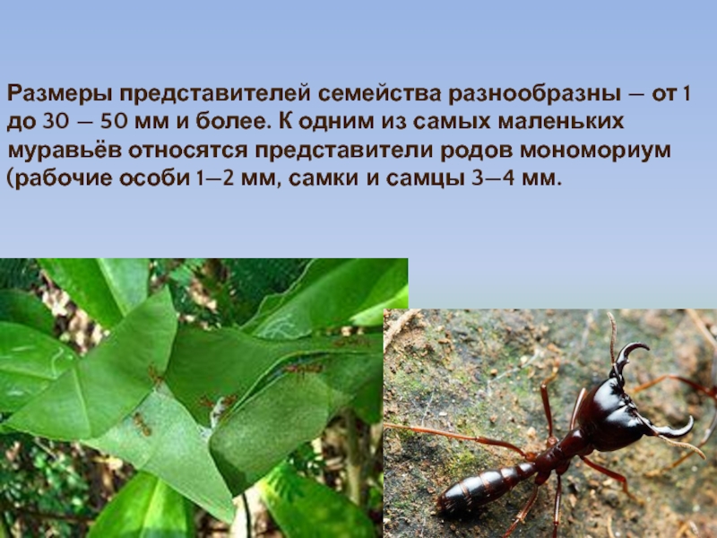 К одним из самых маленьких муравьёв относятся представители родов мономориум (рабочие особи 1—2 мм, самки и самцы 3—4 мм.