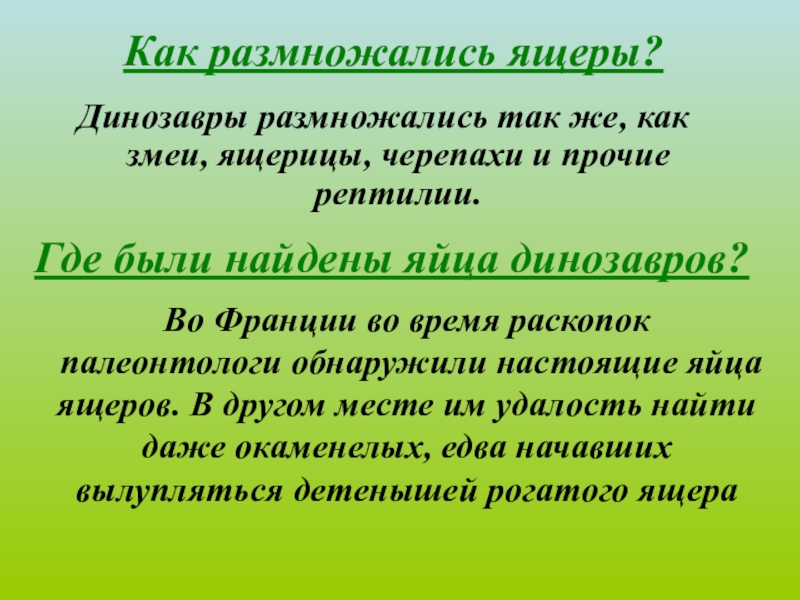 Во Франции во время раскопок палеонтологи обнаружили настоящие яйца ящеров. В другом месте им удалость найти даже окаменелых, едва начавших вылупляться детенышей рогатого ящера