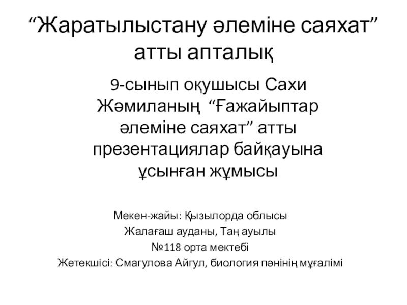 “Жаратылыстану әлеміне саяхат” атты апталық 9-сынып оқушысы Сахи Жәмиланың “Ғажайыптар әлеміне саяхат” атты презентациялар байқауына ұсынған жұмысыМекен-жайы: Қызылорда облысыЖалағаш ауданы, Таң ауылы№118 орта мектебіЖетекшісі: Смагулова Айгул, биология пәнінің мұғалімі