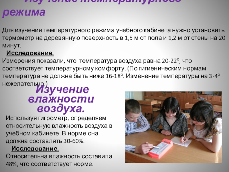Используя гигрометр, определяем относительную влажность воздуха в учебном кабинете. В норме она должна составлять 30-60%.