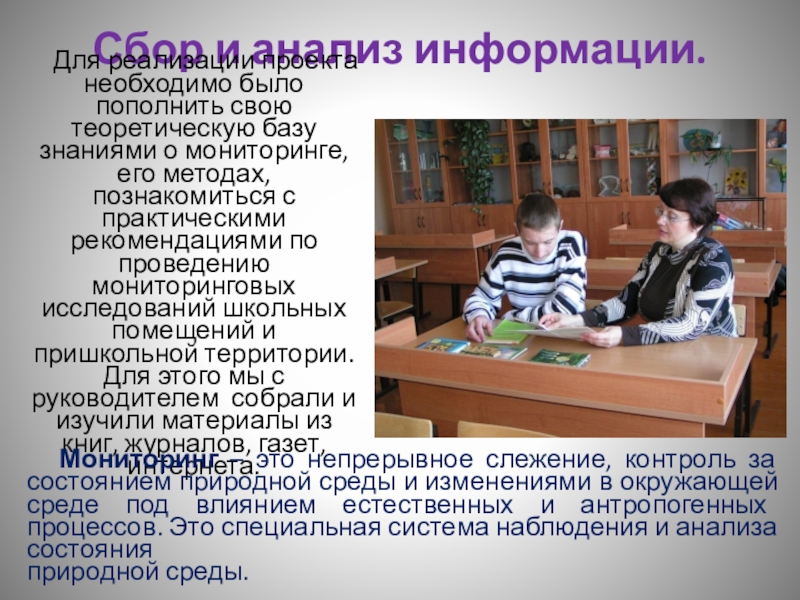 Мониторинг – это непрерывное слежение, контроль за состоянием природной среды и изменениями в окружающей среде под влиянием естественных и антропогенных процессов. Это специальная система наблюдения и анализа состояния