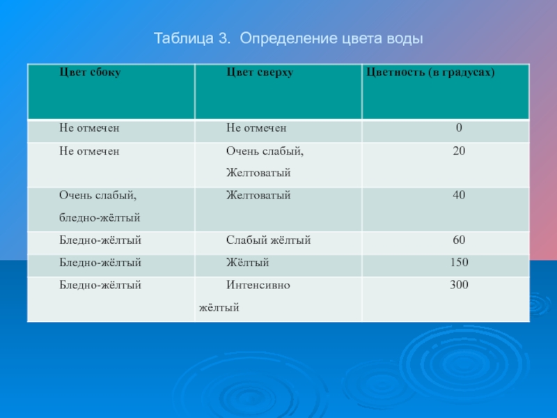 Слайд 8 Таблица 3. Определение цвета воды