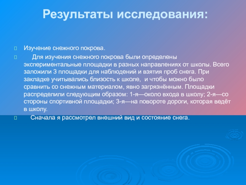 определены экспериментальные площадки в разных направлениях от школы. Всего заложили 3 площадки для наблюдений и взятия проб снега. При закладке учитывались близость к школе, и чтобы можно было сравнить со снежным материалом, явно загрязнённым. Площадки распределили следующим образом: 1-я—около входа в школу; 2-я—со стороны спортивной площадки; 3-я—на повороте дороги, которая ведёт в школу.