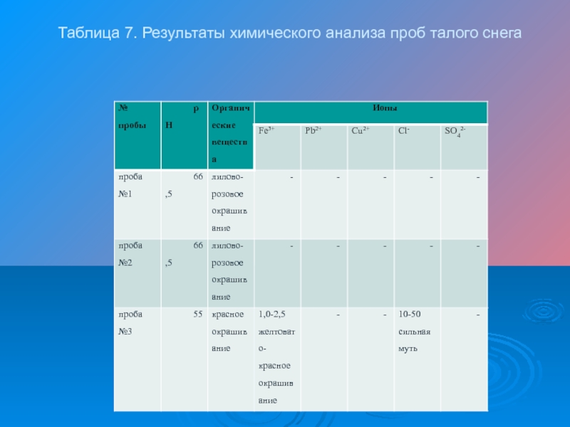 Слайд 23Таблица 7. Результаты химического анализа проб талого снега