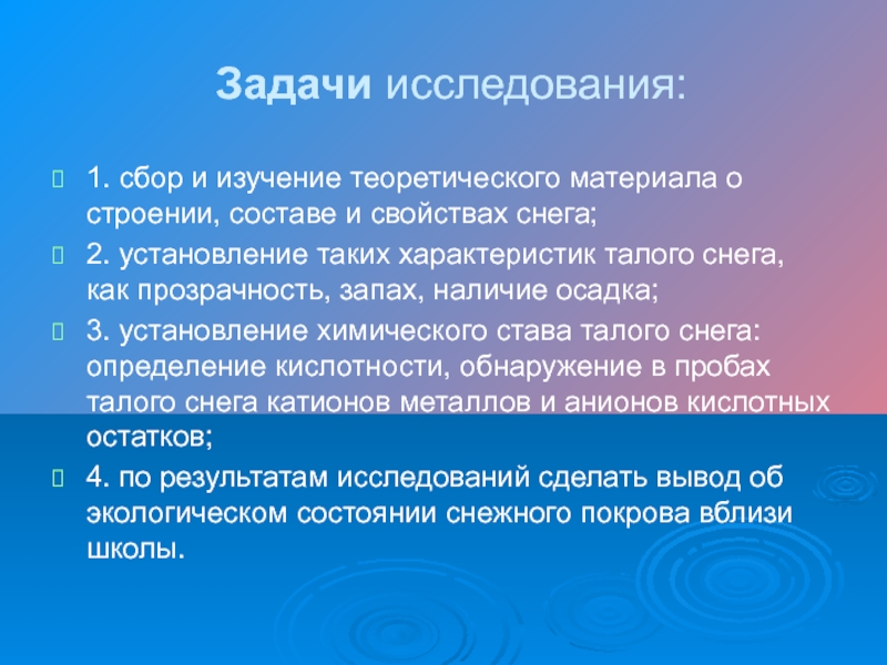 4. по результатам исследований сделать вывод об экологическом состоянии снежного покрова вблизи школы.