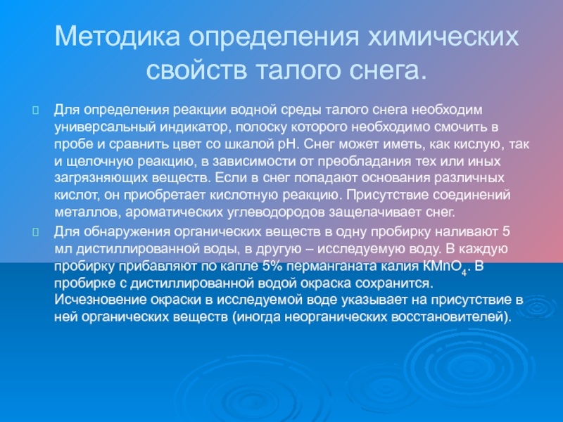 Слайд 9Методика определения химических свойств талого снега.