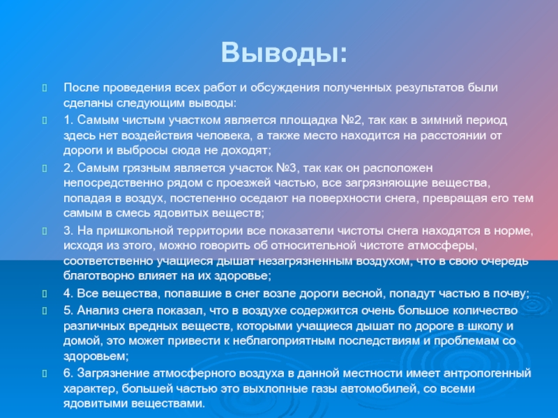 5. Анализ снега показал, что в воздухе содержится очень большое количество различных вредных веществ, которыми учащиеся дышат по дороге в школу и домой, это может привести к неблагоприятным последствиям и проблемам со здоровьем;