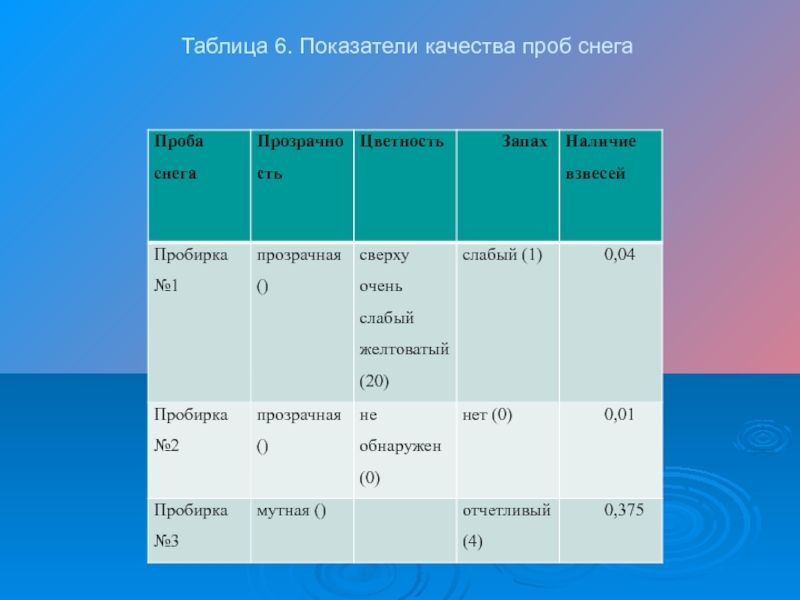 Слайд 21Таблица 6. Показатели качества проб снега