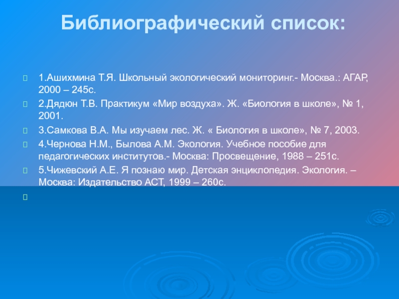 1.Ашихмина Т.Я. Школьный экологический мониторинг.- Москва.: АГАР, 2000 – 245с.