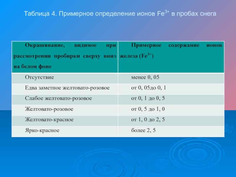 Слайд 11Таблица 4. Примерное определение ионов Fe3+ в пробах снега