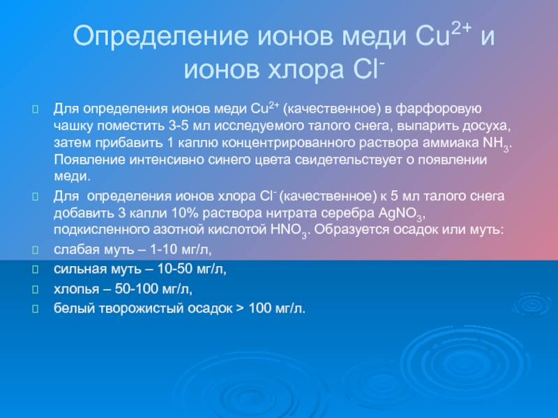 меди Cu2+ (качественное) в фарфоровую чашку поместить 3-5 мл исследуемого талого снега, выпарить досуха, затем прибавить 1 каплю концентрированного раствора аммиака NH3. Появление интенсивно синего цвета свидетельствует о появлении меди.
