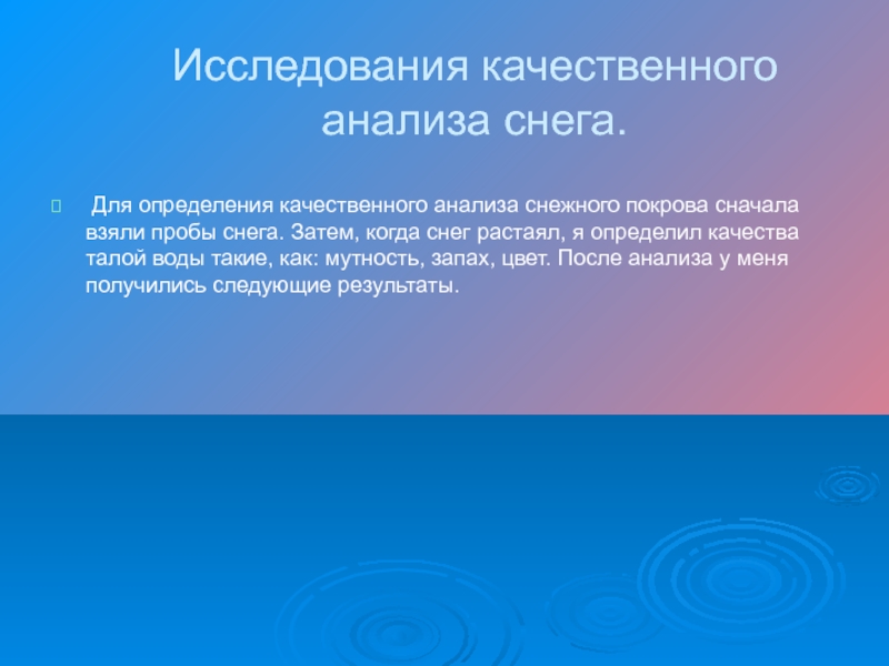 Слайд 20Исследования качественного анализа снега.