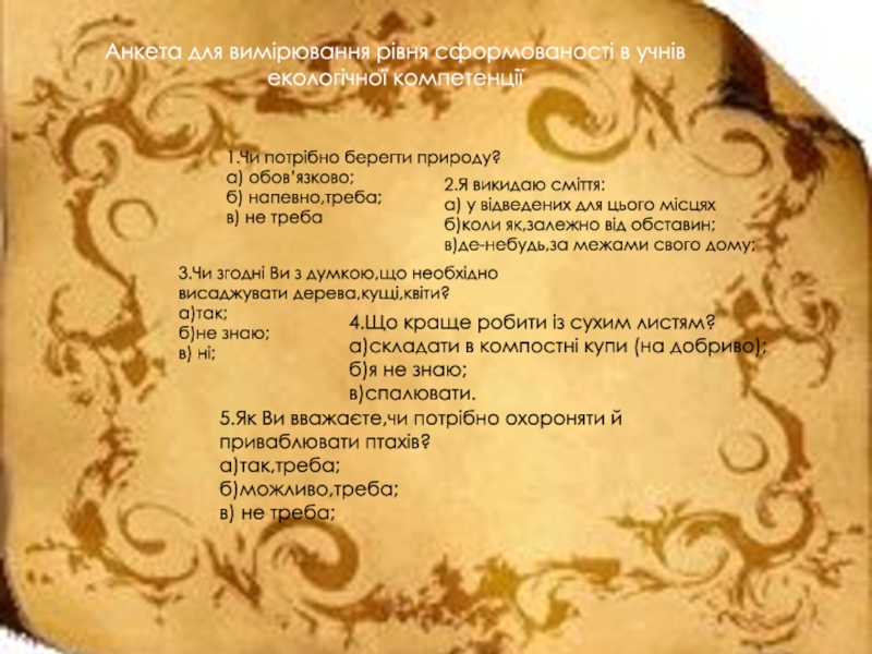 Анкета для вимірювання рівня сформованості в учнів екологічної компетенції