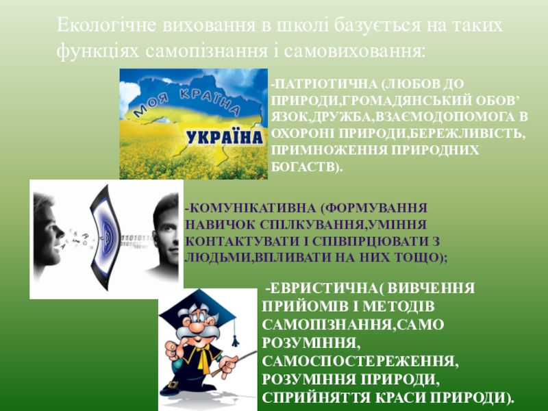 -ПАТРІОТИЧНА (ЛЮБОВ ДО ПРИРОДИ,ГРОМАДЯНСЬКИЙ ОБОВ’ЯЗОК,ДРУЖБА,ВЗАЄМОДОПОМОГА В ОХОРОНІ ПРИРОДИ,БЕРЕЖЛИВІСТЬ,ПРИМНОЖЕННЯ ПРИРОДНИХ БОГАСТВ).
