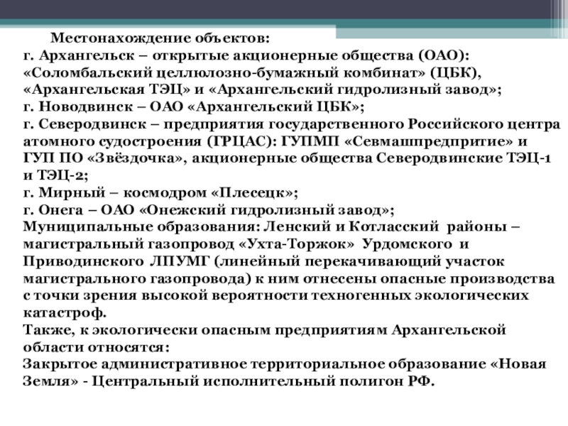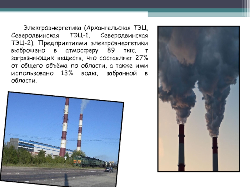 вредными примесями, поступающими от стационарных источников предприятий целлюлозно-бумажной промышленности. В 2009 г. зафиксированы экстремально высокие концентрации метилмеркаптана в г. Новодвинске и в г. Архангельске. Значителен вклад в загрязнение атмосферного воздуха предприятий теплоэнергетики, в частности, Северодвинской и Архангельской ТЭЦ. Города Архангельск, Новодвинск и Северодвинск остаются центрами образования и накопления основного объема промышленных и бытовых отходов, проблема утилизации которых в области весьма актуальна.
