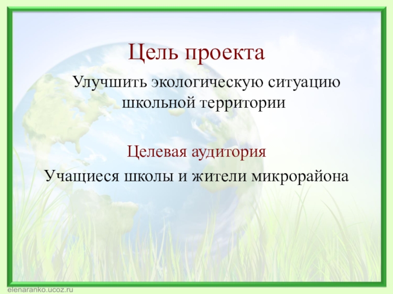Цель проекта	Улучшить экологическую ситуацию школьной территорииЦелевая аудиторияУчащиеся школы и жители микрорайона