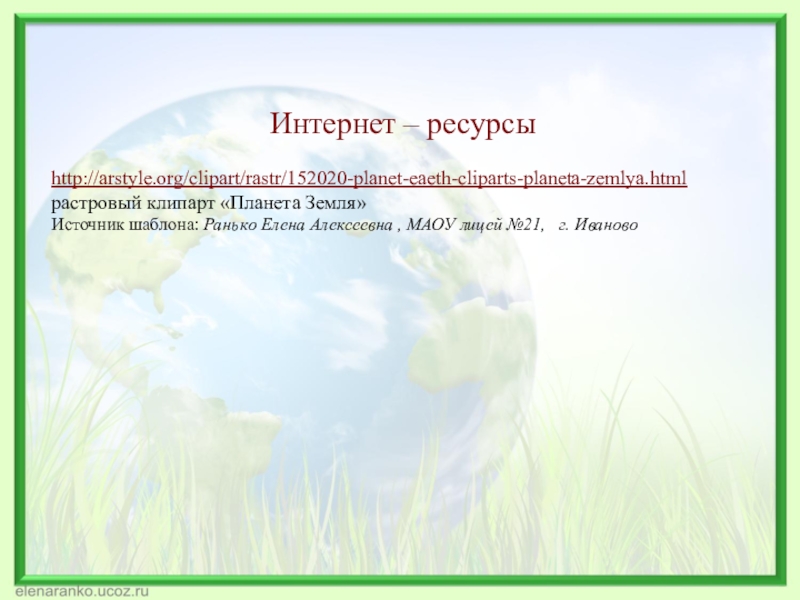 Интернет – ресурсыhttp://arstyle.org/clipart/rastr/152020-planet-eaeth-cliparts-planeta-zemlya.html  растровый клипарт «Планета Земля»Источник шаблона: Ранько Елена Алексеевна , МАОУ лицей №21,