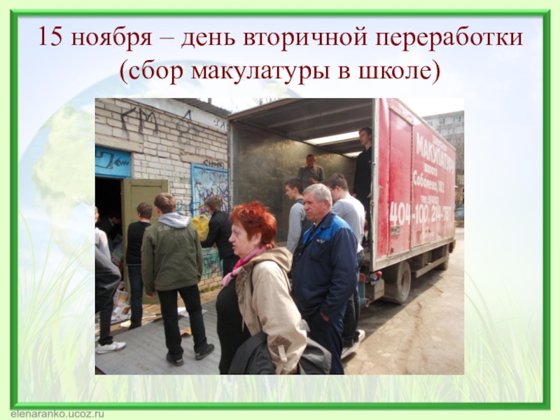 Слайд 2015 ноября – день вторичной переработки (сбор макулатуры в школе)