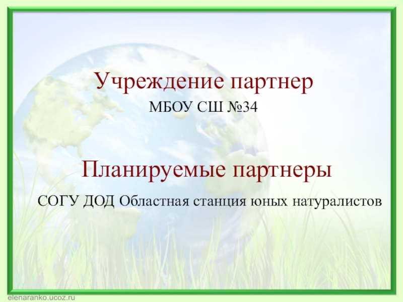 Планируемые партнеры  СОГУ ДОД Областная станция юных натуралистов Учреждение партнерМБОУ СШ №34