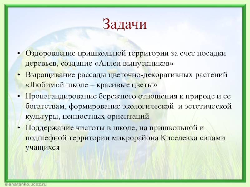 ЗадачиОздоровление пришкольной территории за счет посадки деревьев, создание «Аллеи выпускников» Выращивание рассады цветочно-декоративных растений «Любимой школе –