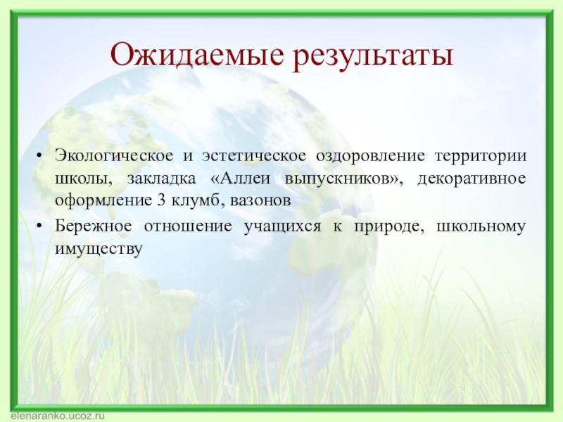 Ожидаемые результатыЭкологическое и эстетическое оздоровление территории школы, закладка «Аллеи выпускников», декоративное оформление 3 клумб, вазоновБережное отношение учащихся