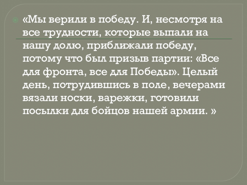 Слайд 9«Мы верили в победу. И, несмотря на все трудности, которые выпали