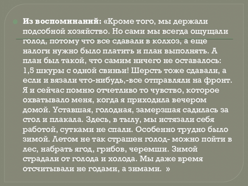 всегда ощущали голод, потому что все сдавали в колхоз, а еще налоги нужно было платить и план выполнять. А план был такой, что самим ничего не оставалось: 1,5 шкуры с одной свиньи! Шерсть тоже сдавали, а если и вязали что-нибудь,-все отправляли на фронт. Я и сейчас помню отчетливо то чувство, которое охватывало меня, когда я приходила вечером домой. Уставшая, голодная, замерзшая садилась за стол и плакала. Здесь, в тылу, мы истязали себя работой, сутками не спали. Особенно трудно было зимой. Летом не так страшен голод- можно пойти в лес, набрать ягод, грибов, черемши. Зимой страдали от голода и холода. Мы даже время отсчитывали не годами, а зимами. »