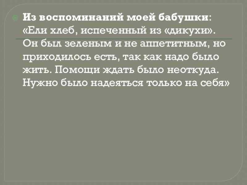Слайд 5Из воспоминаний моей бабушки: «Ели хлеб, испеченный из «дикухи». Он был