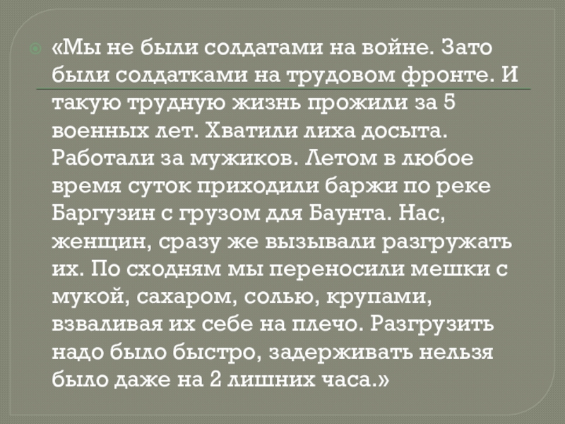 фронте. И такую трудную жизнь прожили за 5 военных лет. Хватили лиха досыта. Работали за мужиков. Летом в любое время суток приходили баржи по реке Баргузин с грузом для Баунта. Нас, женщин, сразу же вызывали разгружать их. По сходням мы переносили мешки с мукой, сахаром, солью, крупами, взваливая их себе на плечо. Разгрузить надо было быстро, задерживать нельзя было даже на 2 лишних часа.»