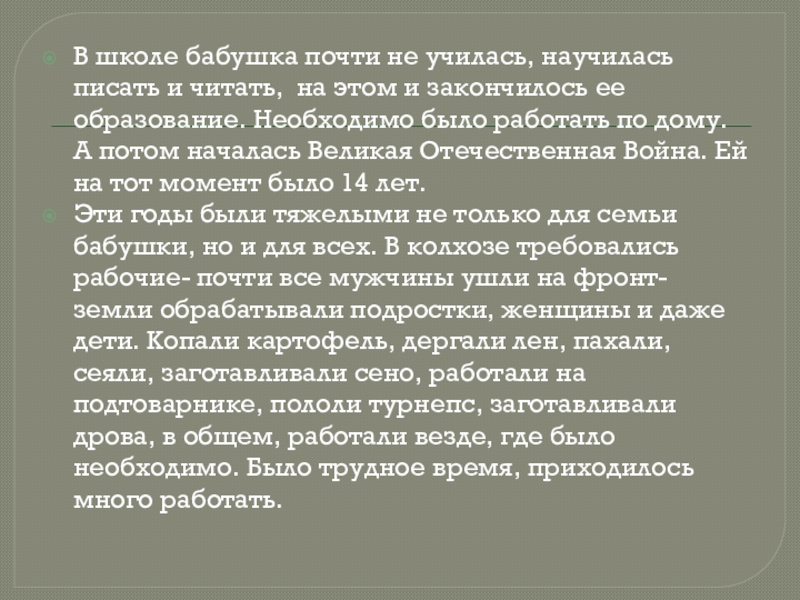 Слайд 3В школе бабушка почти не училась, научилась писать и читать, на
