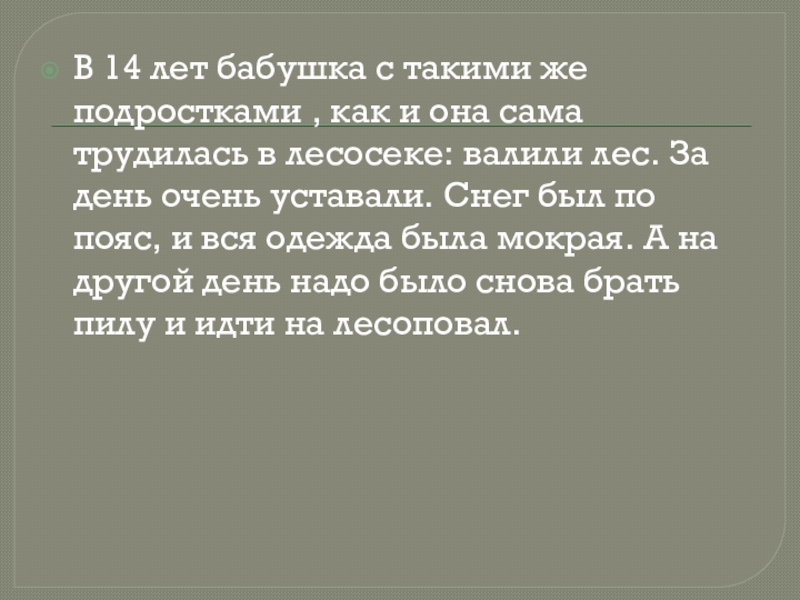 она сама трудилась в лесосеке: валили лес. За день очень уставали. Снег был по пояс, и вся одежда была мокрая. А на другой день надо было снова брать пилу и идти на лесоповал.
