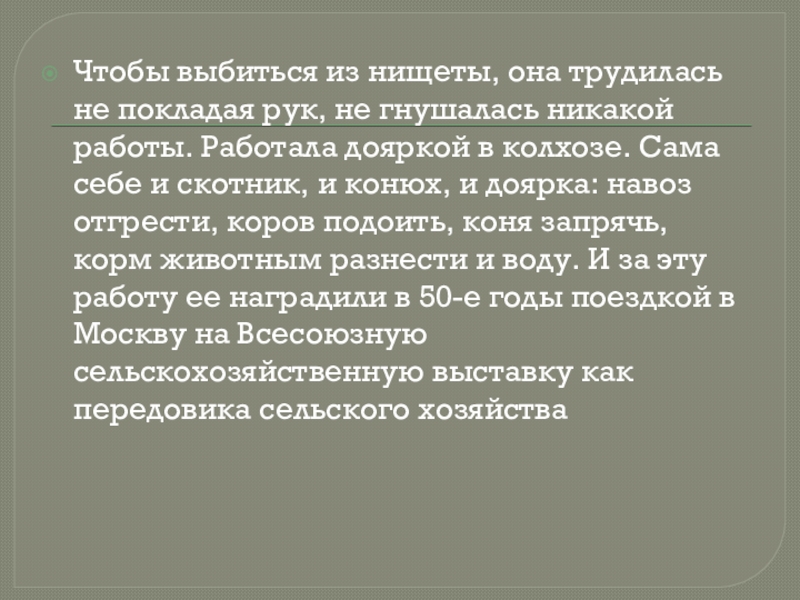 Слайд 6Чтобы выбиться из нищеты, она трудилась не покладая рук, не гнушалась