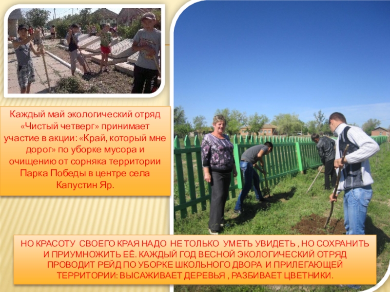 Каждый май экологический отряд «Чистый четверг» принимает участие в акции: «Край, который мне дорог» по уборке мусора и очищению от сорняка территории Парка Победы в центре села Капустин Яр.