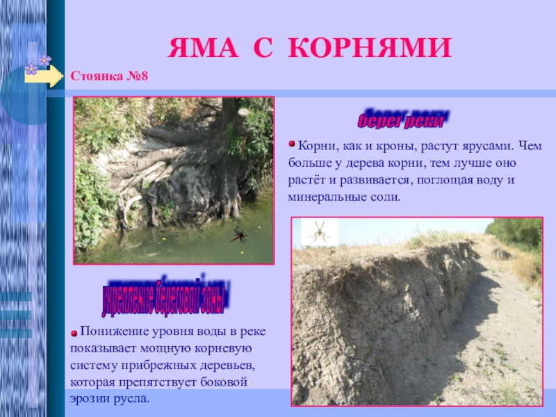 Понижение уровня воды в реке показывает мощную корневую систему прибрежных деревьев, которая препятствует боковой эрозии русла.
