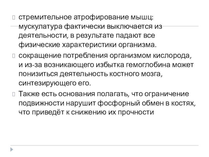 стремительное атрофирование мышц: мускулатура фактически выключается из деятельности, в результате падают