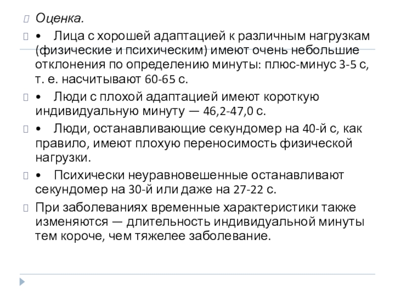 • Люди с плохой адаптацией имеют короткую индивидуальную минуту — 46,2-47,0 с.