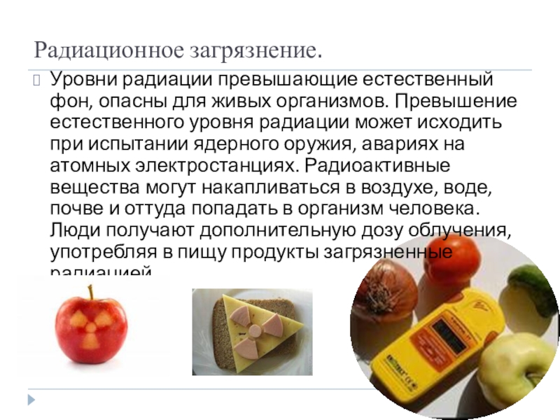 естественного уровня радиации может исходить при испытании ядерного оружия, авариях на атомных электростанциях. Радиоактивные вещества могут накапливаться в воздухе, воде, почве и оттуда попадать в организм человека. Люди получают дополнительную дозу облучения, употребляя в пищу продукты загрязненные радиацией.